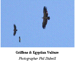 By 5pm we had seen many birds of prey, peregrine falcon, eagles, vultures, a possible Bonelli's eagle and several kestrels. Small birds weren't in abundance stonechats and linnets were noticeable but very little else. As we were about to leave waves of raptors came over the ridge. The birds were gliding close to the hillside, griffon and Egyptian vultures, black kites, short-toed eagles and honey buzzards. This movement lasted for two hours, after taking lots of photographs we made our way back to the hotel. |