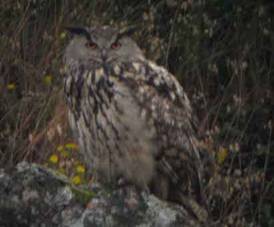 After lunch we motored up to Monfragüe, with the intention of being at Portilla del Tiétar for dusk. We stopped at both the Punte del Cardenal and Fuente de los Tres Canos viewpoints, on the way to and from Tiétar respectively. Punte del Cardenal produced Subalpine Warbler and Cirl Bunting but not the hoped for Bonelli’s Eagle, whilst Fuente de los Tres Canos produced more Subalpines as well as Dartford Warbler, Black-eared Wheatear and some very showy Thekla Larks. Arriving early than expected Tiétar in mid afternoon it didn’t take us long to find a single well grown Eagle Owl chick. It was well out in the open, which given the heavy rain was not the most sensible position for it to be in. This is probably why it then moved across the cliff and found the shelter of a small tree. After we had been sat in the hide sheltering for about an hour, John called us over having found an adult bird sat right out in the open. This bird gave great views, allowing some half reasonable digi-scoped photos to be taken despite the poor light. We didn’t see the semi-resident Spanish Imperial Eagle here - though this site has not been used in 2007, at least one adult bird has been seen regularly from the mirador.