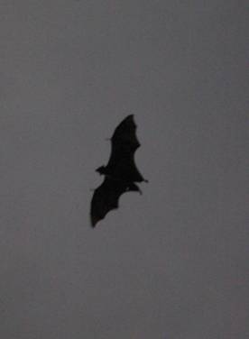 5. Indian Flying Fox Pteropus giganteus giganteus. Many over Hotel Serendib, Bentota, 3.iv.2011 and every evening seen coming into the palms, attracted by the Arrach sap; roosting in mangroves on Bentota Ganga, 4.iv.2011; seen flying in afternoon daylight above this roost on 5.iv.2011. The only flying fox in Sri Lanka and often seen hanging dead and desiccated from power lines.