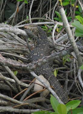 8. Water Monitor Varanus monitor kabaragoya or salvator. Seen lounging in the mangroves along Bentota Ganga, from the boat 4.iv.2011; one very large one disturbed by the lilypond at Galapatha Temple, Bentota 9.iv.2011,