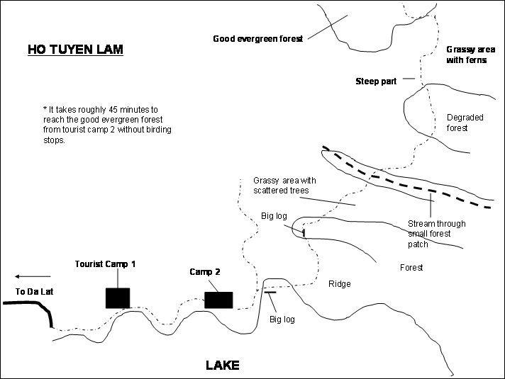 This is a man-made lake some 4 km. south of Dalat. The interesting patches of evergreen forest are found at the southern end of the lake.