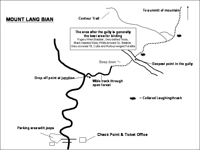Around town are some birding sites which can be easily reached from Dalat. Mostly tracts of pine forest but also some remnant patches of montane evergreen forest which holds most of the specialties. The specialties are the rare Yellow-billed Nuthatch and 4 vietnamese endemics: Grey-crowned Crocias, Collared Laughingthrush, Orange-breasted Laughingthrush, Vietnamese Greenfinch and Vietnamese Crossbill ( a likely future split)